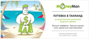 В акции участвуют все вебмастера подключённые к офферу MoneyMan через партнёрские сети. Суть акции проста – пять веб-мастеров, показавших лучший результат за период с 1 октября 2014 года по 31 декабря 2014 года, получают приз – двухнедельный отдых в Тайланде, с оплатой перелёта туда и обратно, трансфер до места проживания, оплата двухнедельного проживания на побережье океана.Каждый победитель имеет право взять с собой еще одного человека, при полной оплате его перелёта туда и обратно. Под результатом подразумевается наибольшее количество выданных займов, с привлечённого трафика каждого веб-мастера.